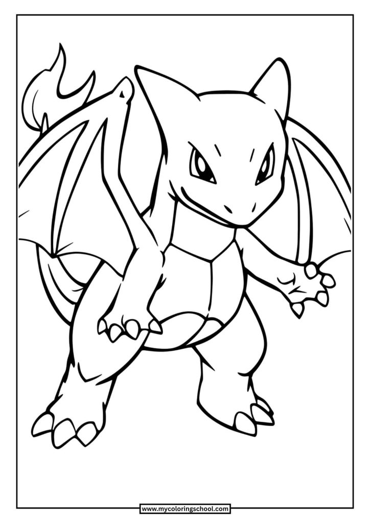 This Pokemon Charizard coloring page shows a strong and fierce dragon-like creature ready for action. It has big wings, sharp claws, and a fiery tail that makes it look powerful and cool. Kids can have fun coloring Charizard’s body in orange, its wings in blue and green shades, and the flame in red and yellow. The bold outlines make it easy to color inside the lines. This page is great for children who love adventure and Pokemon battles while practicing creativity and focus.