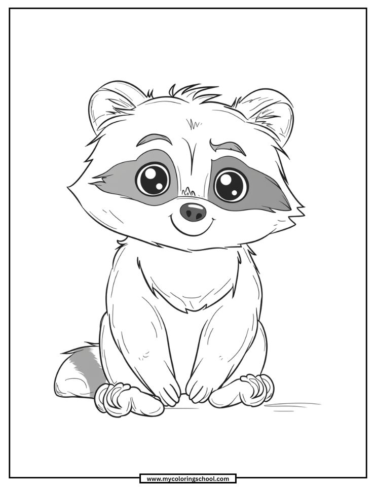 This raccoon coloring page for kids shows a cute and happy raccoon sitting down. It has a big round face with large, shiny eyes and a sweet smile. Dark mask shapes are around its eyes, making it easy to recognize. The body is small and fluffy with simple fur details. Its paws rest neatly in front, and its tail is bushy with clear stripes. The lines are bold and clean, so kids can color easily. Children can use gray, black, or bright colors to make it fun and lively.
